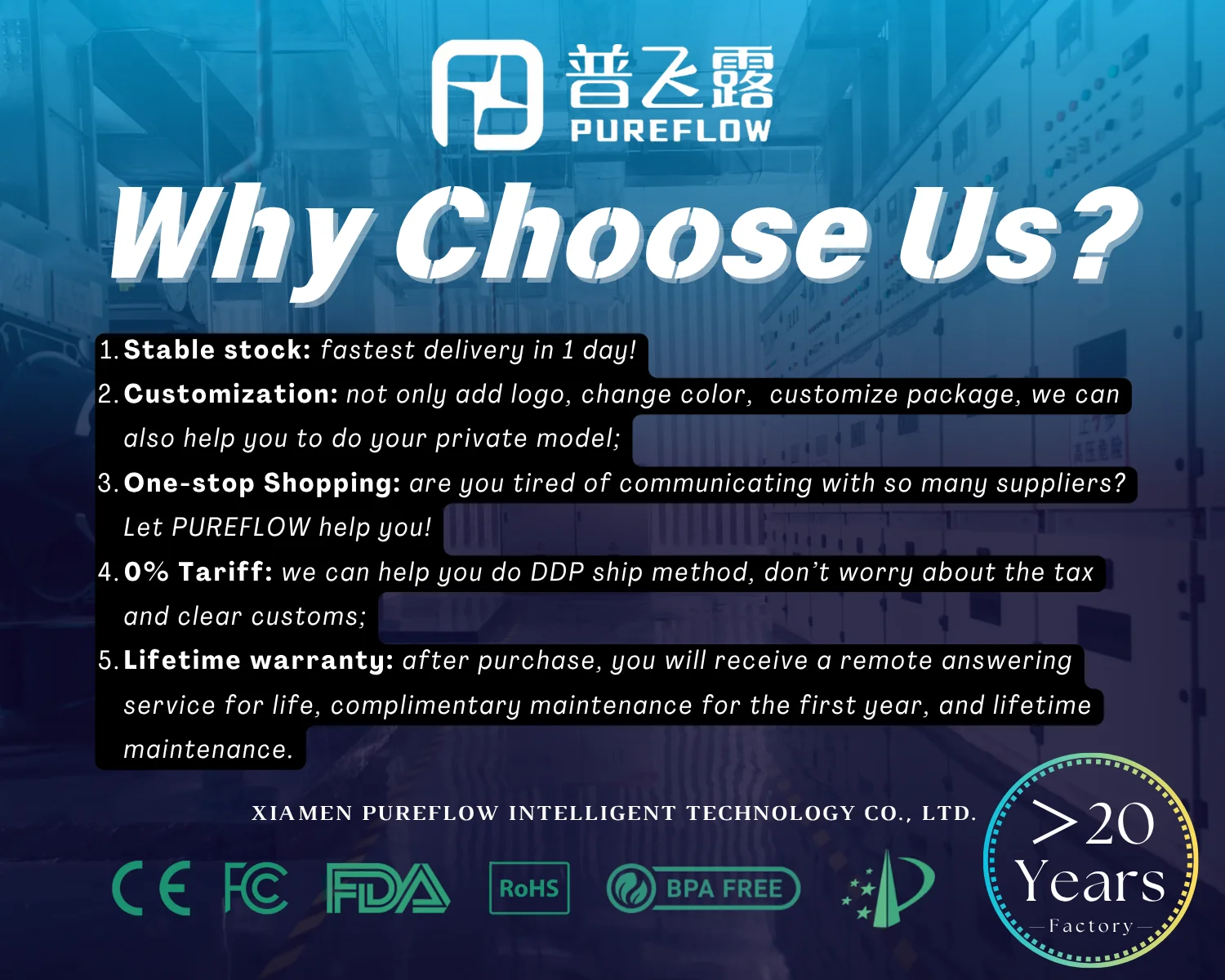 Xiamen PureFlow Intelligent Technology Co., Ltd. was established in 2006,the covers an area of 18000 square meters and employs 500 people and are located in Xiamen, Fujian Province. It’s a professional electrolytic hydrogen enrichment technology that integrates product research and development, production, sales, and service.The specializes in hydrogen health technology products, such as hydrogen rich water cups, hydrogen beauty devices, hydrogen foot therapy machines, and so on.For many years, we have been committed to providing customers with high-quality technology and high-quality 24-hour service, winning a good reputation and credibility. In addition, we have also obtained a patent certificate. Our products not only sell well in various regions of China, but also export to various countries and regions, such as European and American markets. We provide / services. If you have any purchasing needs, please feel free to contact my customer service at any time.